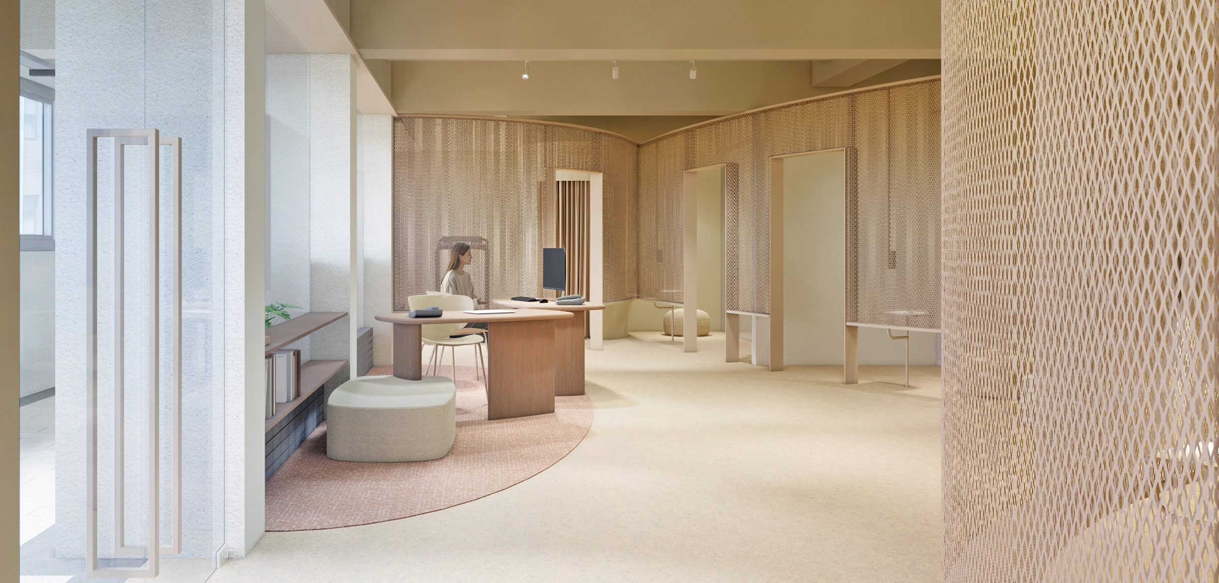 我們將諮商空間理解為一層層的皮層。外層是半透明的屏障,像霧氣般輕薄,既能被看見,也能保有安定的距離;內層則是漸層玻璃所圍合的房間,一個光影柔化的容器,承載著深度對話與傾聽。這種漸進的過渡,正如心理歷程的轉換——從被注意到能安心被理解。